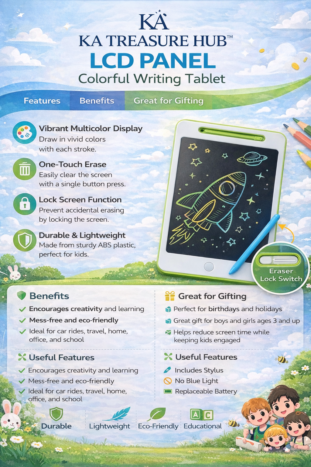 Encourage creativity and learning with this Colorful LCD Writing Tablet, designed for kids and youth to draw, write, and practice without paper or mess. The bright LCD screen displays colorful strokes, making writing and doodling more fun and engaging.