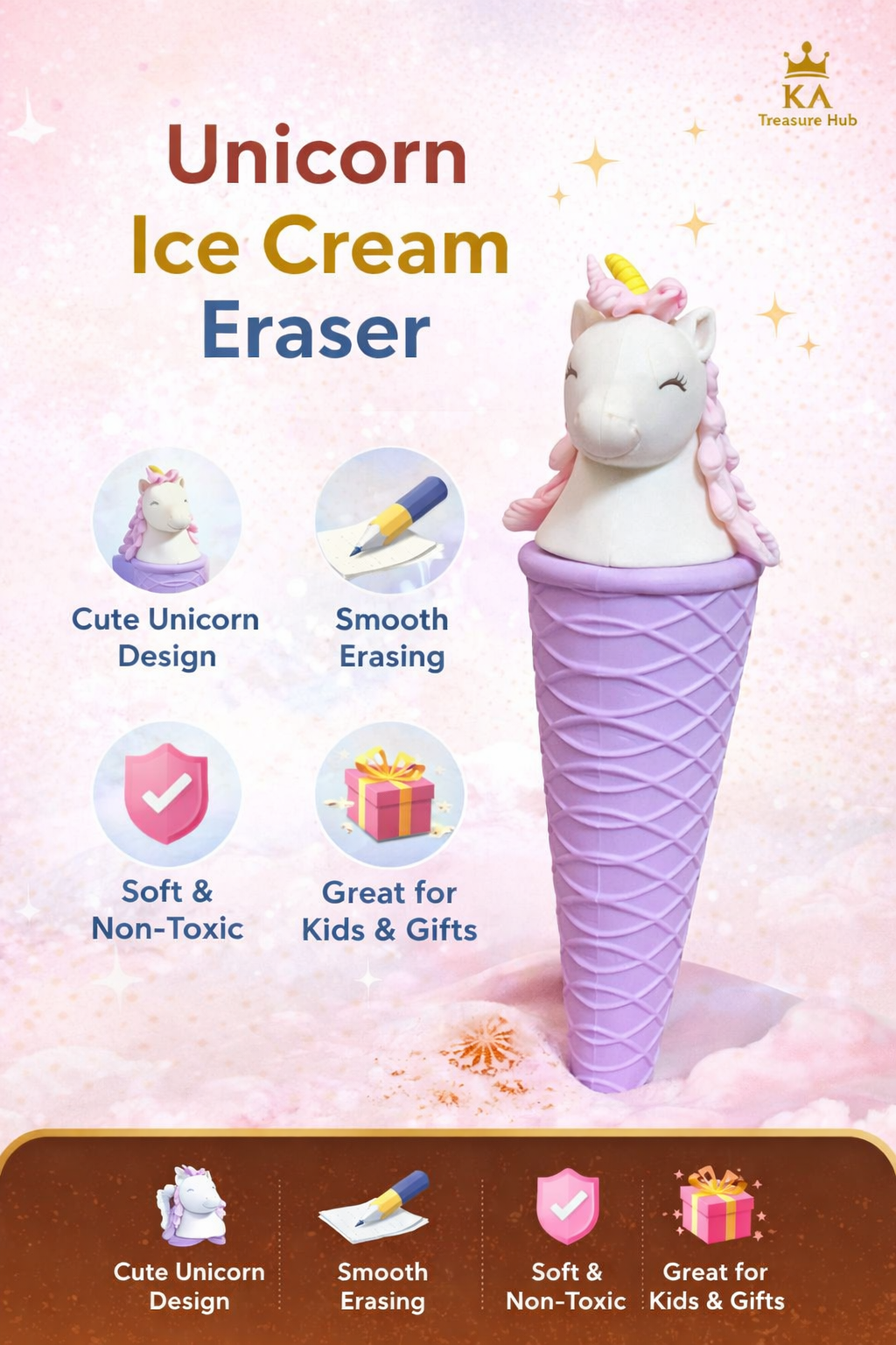 Add a touch of magic to your stationery with this Unicorn Ice Cream Shaped Eraser. Designed in a cute unicorn head with an ice-cream cone style body, this eraser is perfect for kids, students, and unicorn lovers. Made from soft, non-toxic material, it erases pencil marks smoothly without damaging paper. A fun and attractive stationery essential from KA Treasure Hub, ideal for school use and gifting.